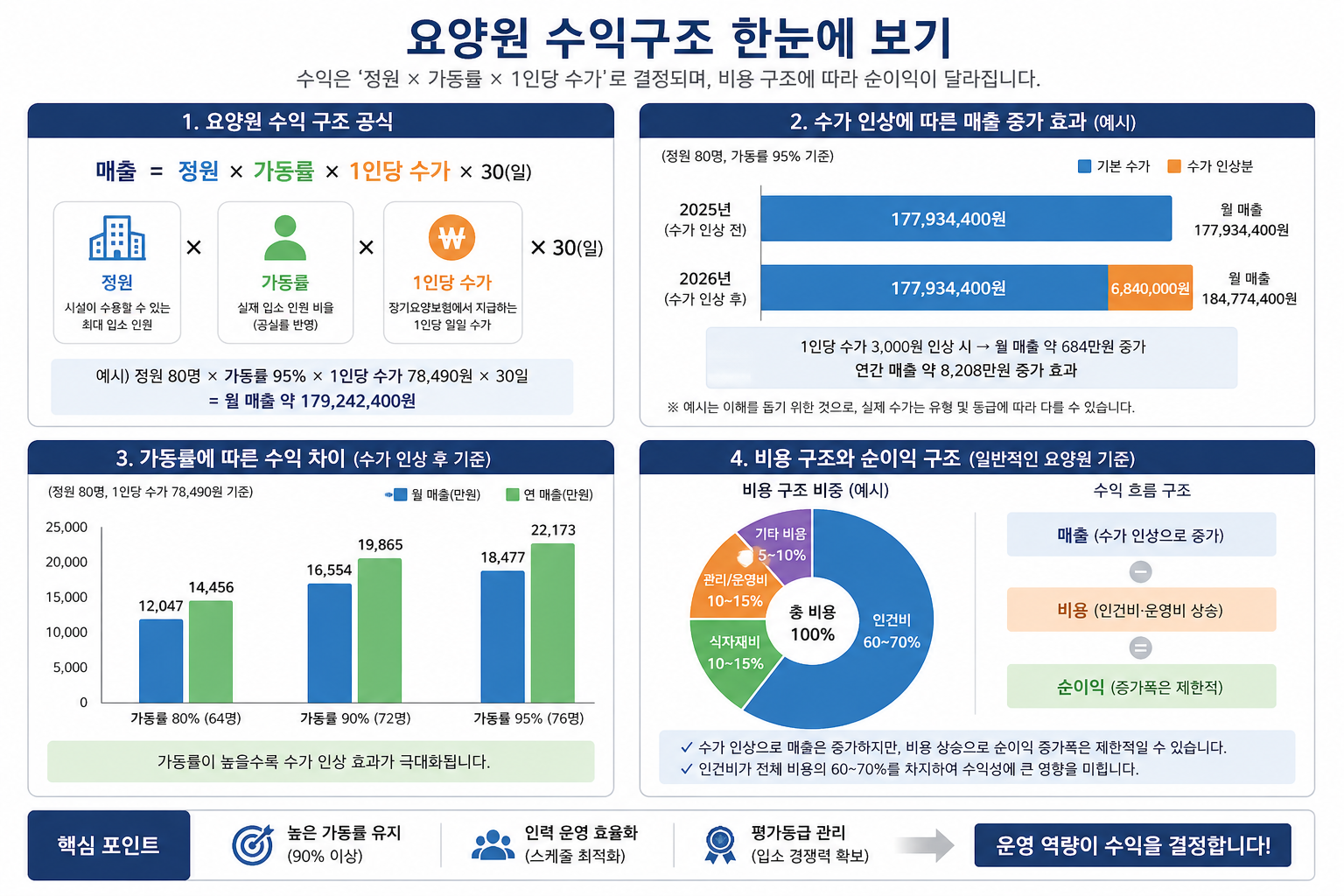 요양원의 매출 구조는 입소 정원, 가동률, 그리고 1인당 수가라는 세 가지 요소로 구성됩니다. 이 중 수가 인상은 가장 직접적으로 매출에 영향을 미치는 요소입니다. 예를 들어 일정 규모의 요양원이 높은 가동률을 유지하고 있는 상황에서 1인당 일일 수가가 소폭 상승하더라도 월 단위 및 연 단위 매출은 의미 있게 증가하게 됩니다. 특히 시설 규모가 클수록 이 증가 효과는 더욱 확대됩니다. 그러나 이러한 매출 증가는 곧바로 순이익 증가로 연결되지 않습니다. 수가 인상은 전반적인 비용 상승을 반영한 결과이기 때문에 동일한 시기에 인건비, 식자재비, 관리비 등 주요 비용 항목도 함께 상승하는 경향이 있습니다. 따라서 매출 증가와 실제 수익 증가를 동일하게 해석하는 것은 무리가 있습니다.